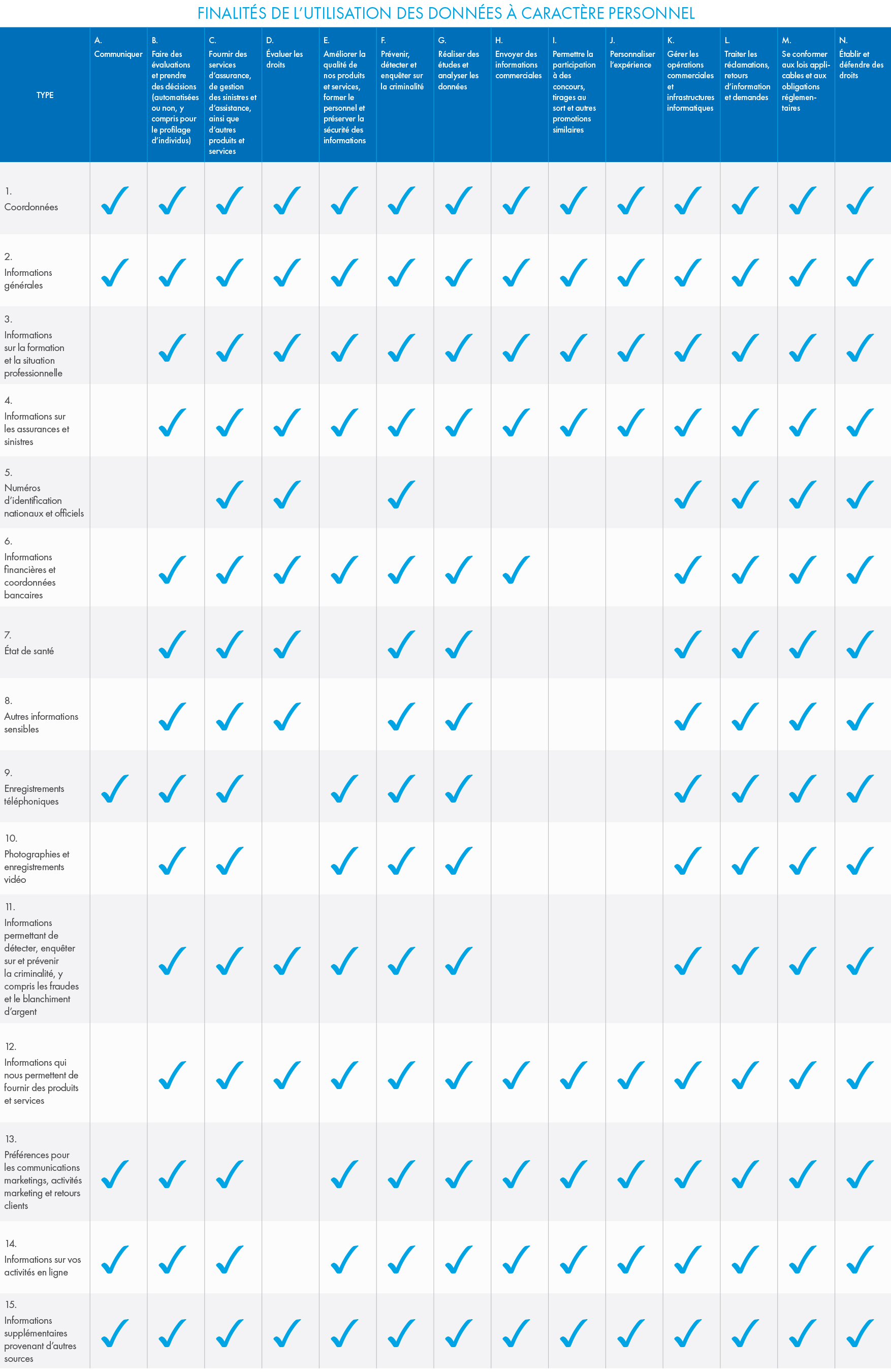 Dans la mesure où notre activité consiste à fournir des services d'assurance, de gestion des réclamations, d'assistance et d’autres services connexes, les informations personnelles que nous détenons et traitons, en fonction de notre relation, sont les suivantes :